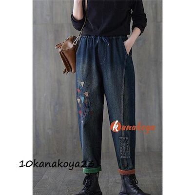 サルエルパンツ デニム 刺繍 裏起毛 テーパードパンツ ボトムス ズボン レディース カジュアル ポケット付き ゆったり ウエストゴム 無地