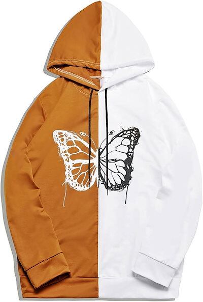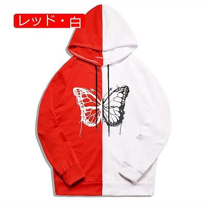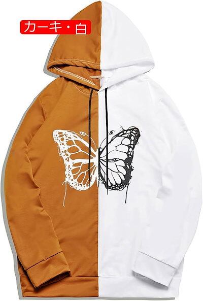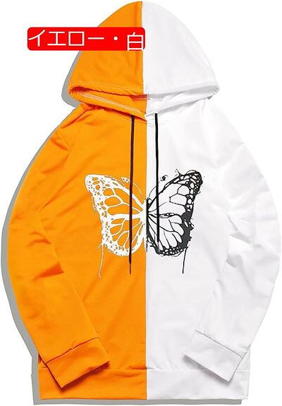フルオーバー メンズ パッチワーク 蝶プリント 長袖パーカー フード付き カップル レディース 秋 春 大きいサイズ トップス 原宿風 ストリート系 柔らかい肌触り 薄手 日常着用 ウォーキング