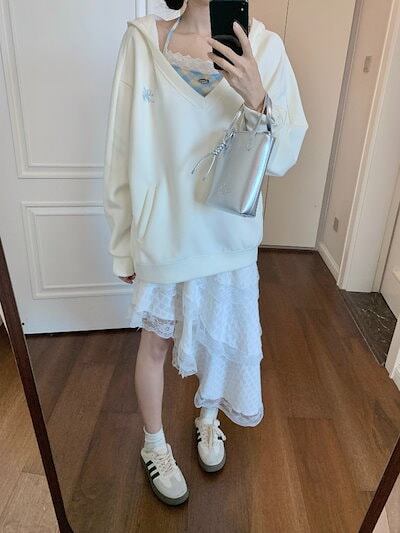 2024 秋冬 韓国 かわいい レディース 無地 普段使い長袖トップスレトロセットアップVネック黑白パーカーブルサイズ丈春カジュアルスポーツファッション系通学学生袖お出かけアップシルエットトラック