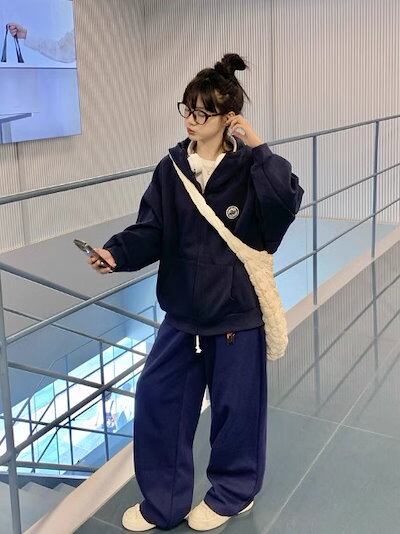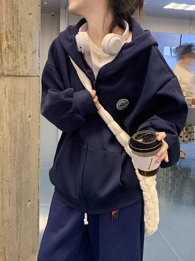 2024 秋冬 韓国 かわいい レディース 無地 フード付き長袖アウターレトロセット黑白フーディーブルサイズ丈トップス春カジュアルスポーツファッション系通学学生袖お出かけアップシルエットトラック
