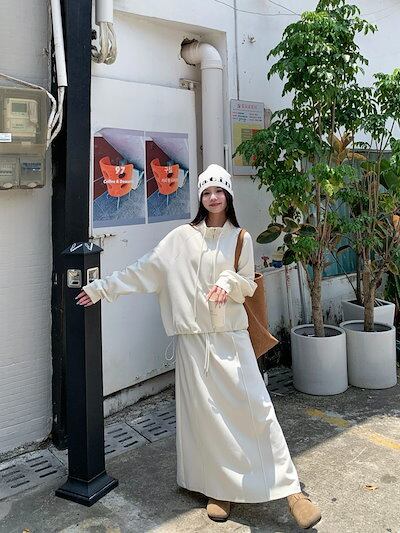 2024 秋冬 韓国 かわいい レディース無地ハイネック長袖アウターレトロセット黑白フーディーハーフサイズ丈トップス春カジュアルスポーツファッション系通学学生袖お出かけアップシルエットトラックロング