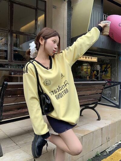 2024 秋冬トップスバイカラー長袖TシャツかわいいK-POPレディース韓国風ロゴ衣装ルーズゆったりカジュアルおしゃれサイズ袖グラフィックシルエットファッション系サイドシャツフット春スポーツVネックT