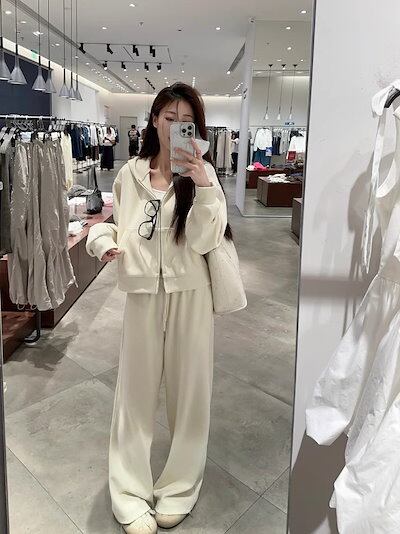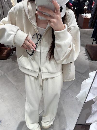 2024 秋冬 韓国 かわいい レディース 無地フード付き長袖アウターレトロセット黑白フーディーダブルサイズ丈トップス春カジュアルスポーツファッション系通学学生袖お出かけアップシルエットトラック羽織り