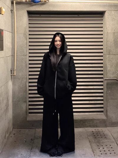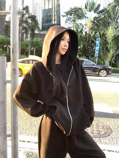 2024秋冬 韓国 かわいい レディース 無地 フード付き長袖アウターレトロセット黑白フーディーブルサイズ丈トップス春カジュアルスポーツファッション系通学学生袖お出かけアップシルエットトラック羽織り