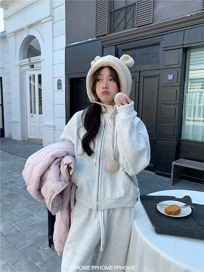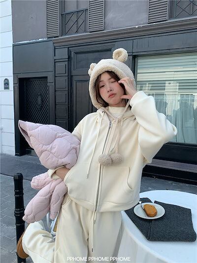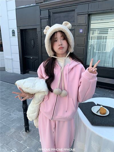 2024秋冬 韓国 かわいい レディース 裹起毛無地 フード付き長袖アウターレトロセットフーディーブルサイズ丈トップス春カジュアルスポーツファッション系通学学生袖お出かけアップシルエットトラック羽織り