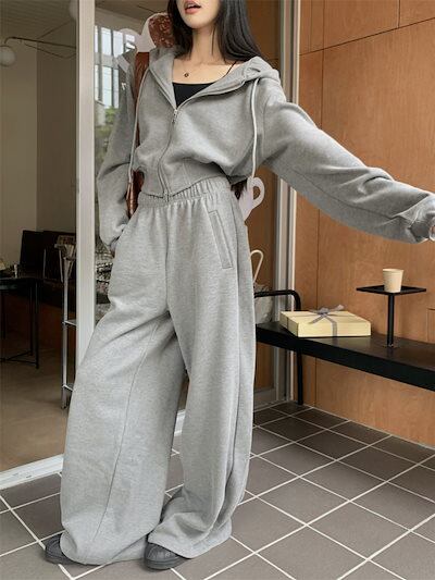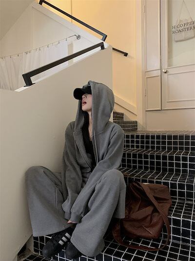 2024 秋冬 韓国 かわいい レディース 無地 フード付き長袖アウターレトロセット黑白フーディーダブルサイズ丈トップス春カジュアルスポーツファッション系通学学生袖お出かけアップシルエットトラック羽織