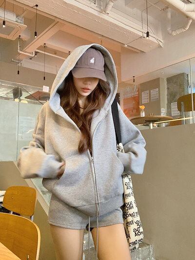 2024 秋冬 韓国 かわいい レディース 無地 フード付き長袖アウターレトロセット黑白フーディーブルサイズ丈トップス春カジュアルスポーツファッション系通学学生袖お出かけアップシルエット袖トラック