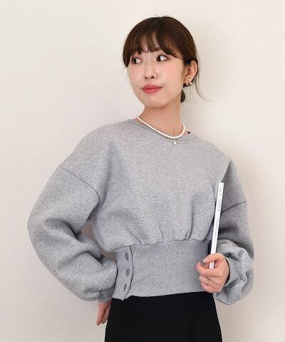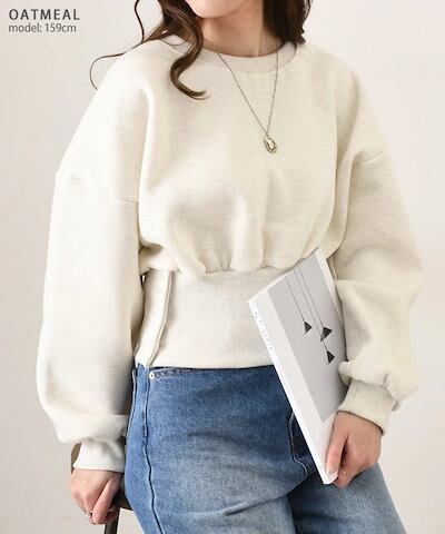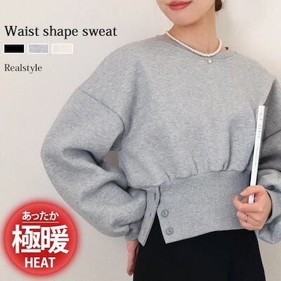 リアル スタイルショート丈裏起毛ウエストシェイプスウェット レディース トップス トレーナー 可愛い 厚手 秋 冬 長袖 綿 コットン おしゃれ シンプル 韓国ファッション カットソー スエット ウエストマーク