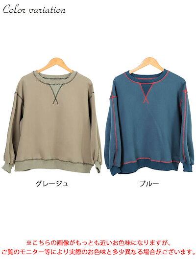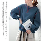 ゴールドジャパン大きいサイズレディース トップス スウェット トレーナー 裏起毛配色ステッチワイドプルオーバー 長袖 裏起毛 暖かい 配色 ステッチ ストレッチ 伸縮 ボリューム ドロップショルダー クルーネック 冬