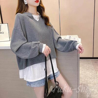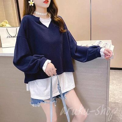 ゆったり ゆるパーカー 長袖 トレーナー レイヤード 重ね着風 切り替えパーカー プルパーカー レディース パーカー