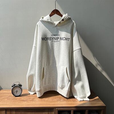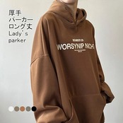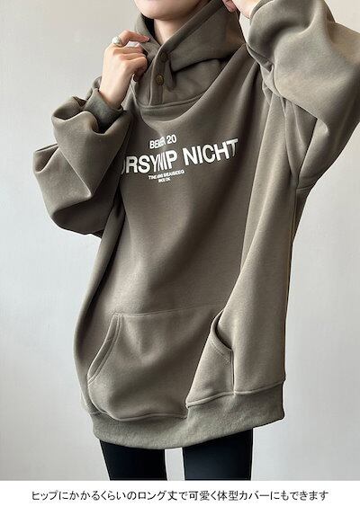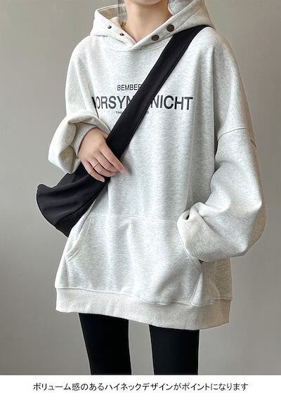 パーカー レディース アウター 英字柄 ハイネック 長袖 厚手 ロング丈 フード付き ボリューム袖 プルオーバー トップス カジュアル 柔らかい 暖かい 体型カバー シンプル 小顔効果 秋冬 快適 通