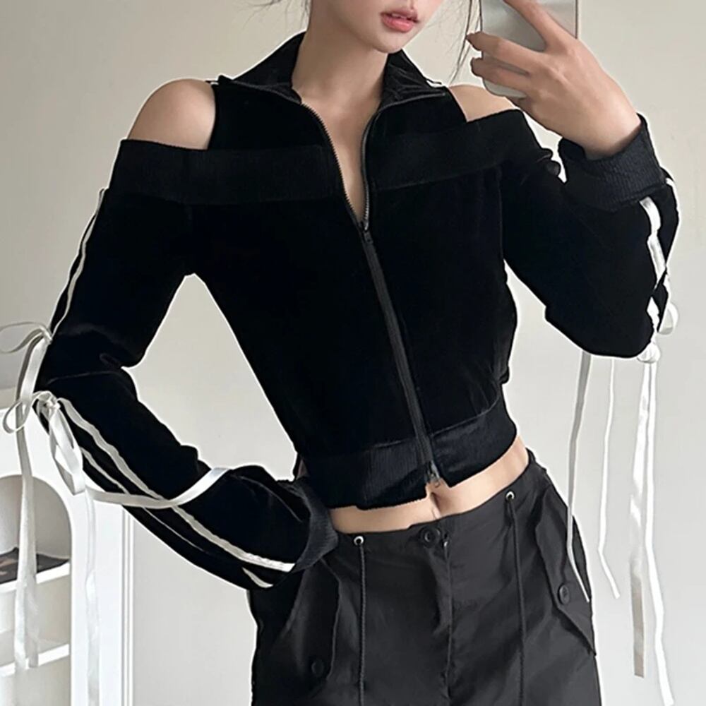 Cibbar-女性用ジッパー式タートルネックスウェットシャツ、シックなパッチワーク、包帯の弓、裸の肩のパーカー、カジュアルな衣装、黒、秋、冬、y2k パーカー ジャージ y2k T240908200428_01
