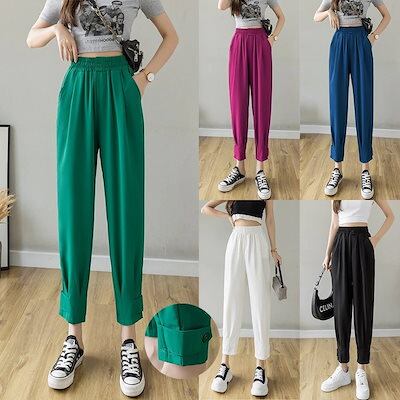夏服レディース接触冷感ボトムスアイスシルクロングパンツスポーツカジュアルスラックス韓国ファッションハーレムパンツ ハイウエスト着痩せ効果