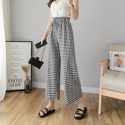 レディース 夏 薄手 ワイドパンツ ハイウエストストレートパンツ カジュアルパンツ 8分丈パンツ 七分丈パンツ チェック柄パンツ バギーパンツ