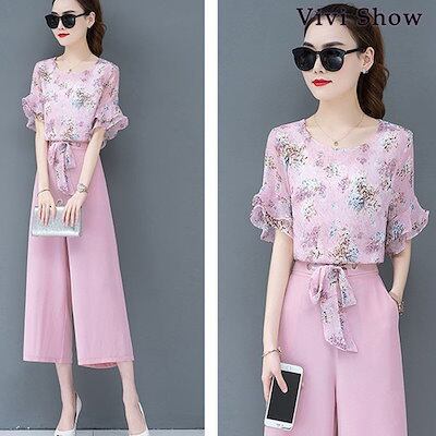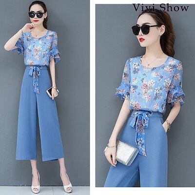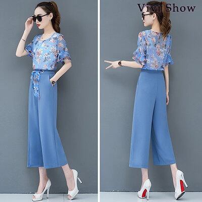 レディース セットアップ 2点セット 花柄 5分袖 ワイドパンツ ブラウス トップス リボン viv