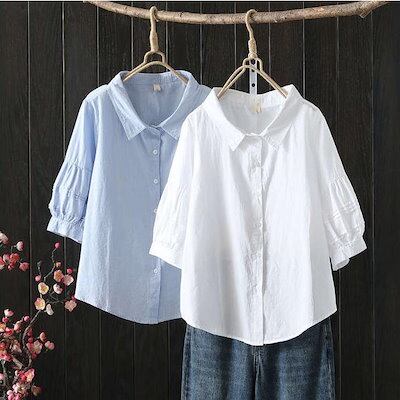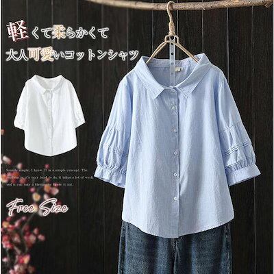 シャツ トップス レディース 半袖 無地 夏 5分袖 ブラウス シャツブラウス 半袖シャツ ホワイトシャツ 綿シャツ 白 バルーンスリーブ