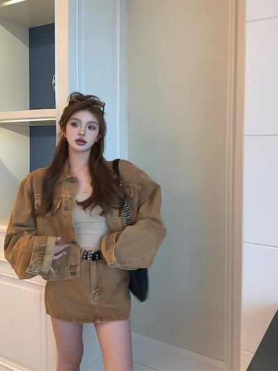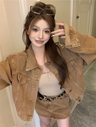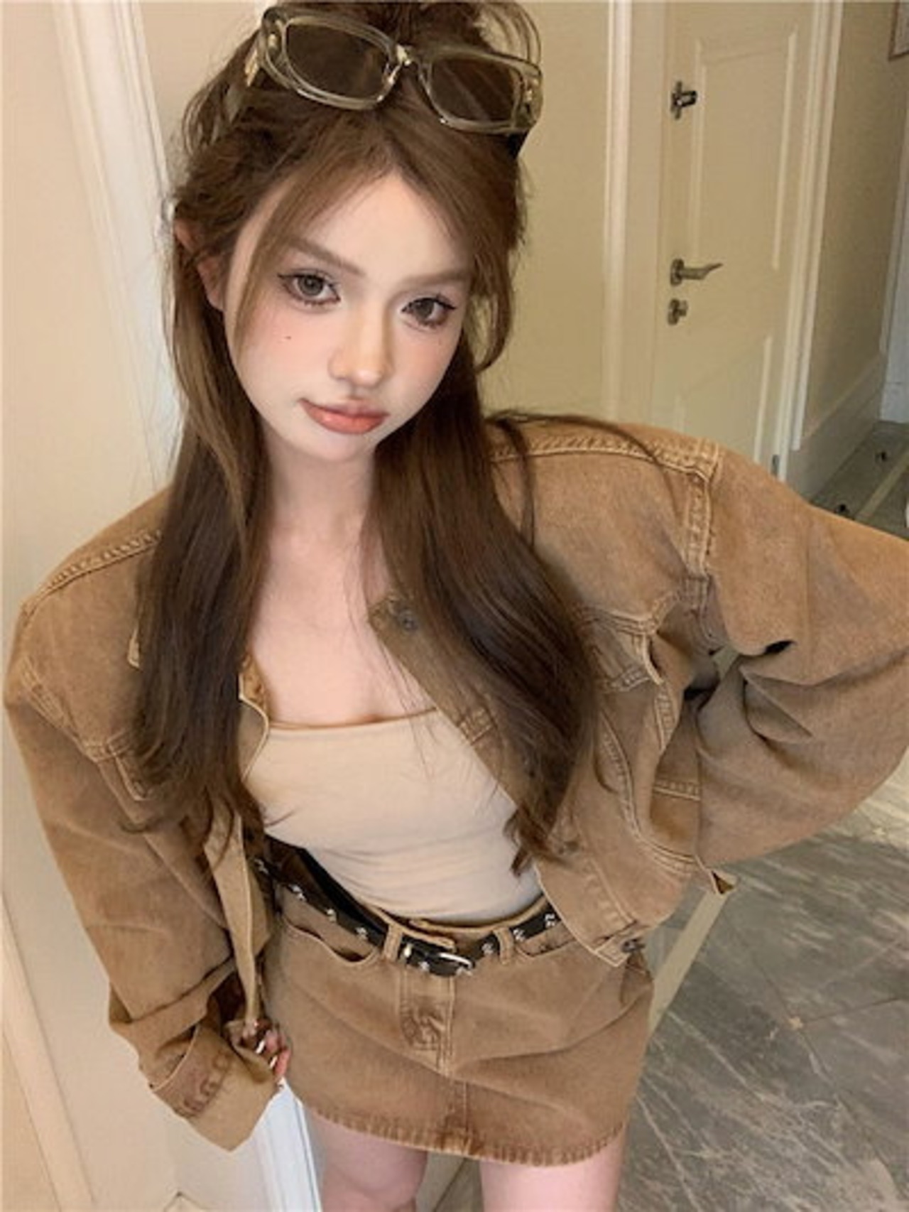 2024 秋冬 2点セット レトロっぽ カジュアル に 王道 ボタンアウター ショート丈トップスジャケット加工 ミニ丈 ハイウエストストレートセットアップ コーデ 韓国系ファッション 上下レディース