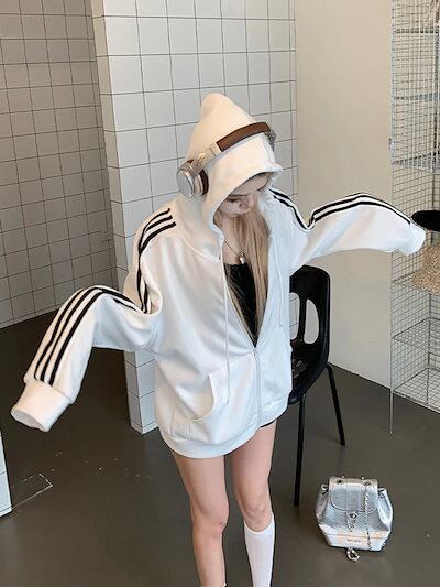 2024 秋トップス パーカー フード付き チャック 長袖 ストライプ ゆったり 細見え 秋 白 黒 おしゃれ かわいい ガーリー キュート 甘め 韓国ファッション レディース お出かけトラック