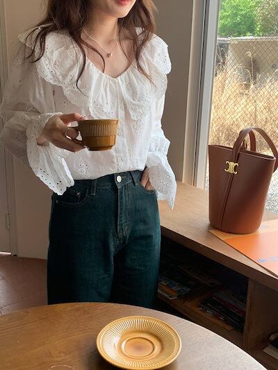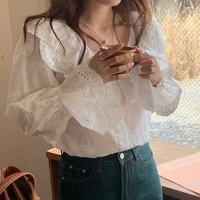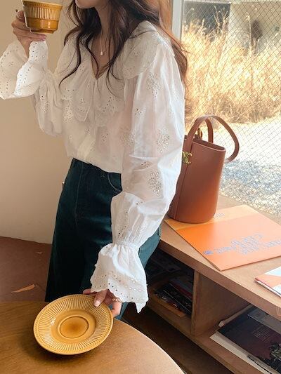 2024 秋冬トップス シャツ 長袖 ボタン 襟 フリル Vネック レース 秋 白 ホワイト おしゃれ かわいい ガーリー キュート ラブリー 甘め 韓国ファッション レディース お出かけ