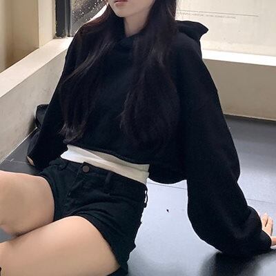 2024 秋冬トップス フード付き スウェット 長袖 丈短め 秋 黒 ブラック おしゃれ かわいい 韓国ファッション レディース お出かけ