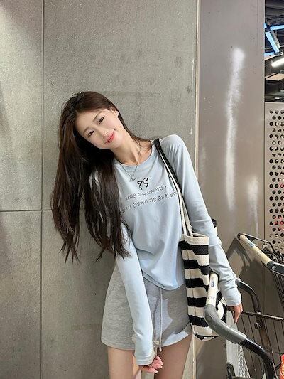 2024 秋冬トップス Tシャツ 長袖 韓国語 ハングル リボン ガーリー 甘め キュート 秋 白 水色 おしゃれ かわいい 韓国ファッション レディース お出かけ