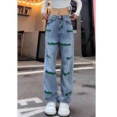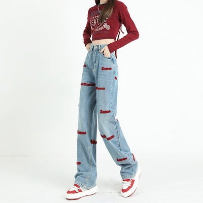 レトロなデザイン感スラックスパンツ 刺繍ジーンズ秋の新型レディース百掛けワイドパンツ モッピングパンツ