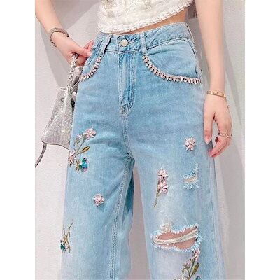 ひんやりボトムス2024 デニムズボン レディース 新作 スートン 刺繍 ダメージ ストレート ワイドパンツ脚長効果!スキニーパンツ