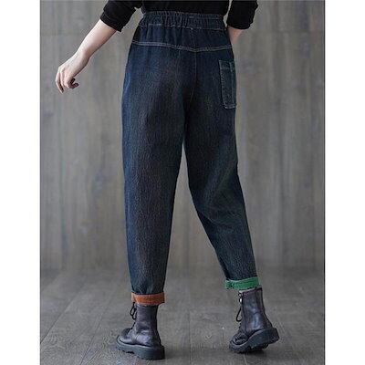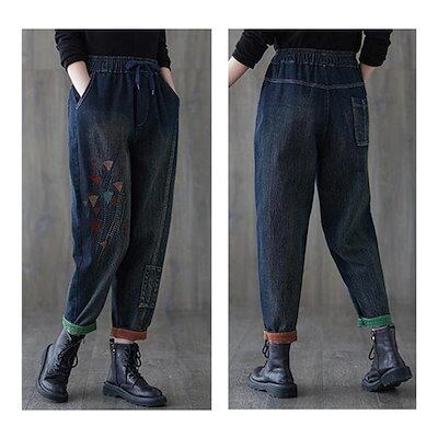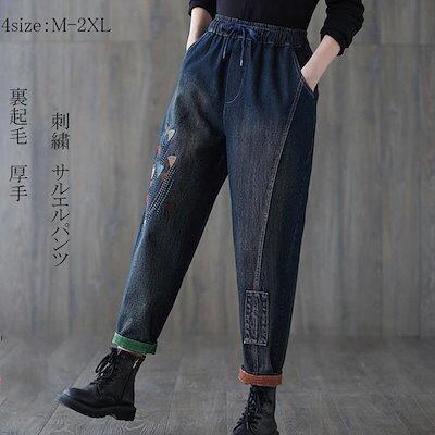 サルエルパンツデニム刺繍裏起毛テーパードパンツボトムスズボンレディースカジュアルポケット付きゆったりウエスト
