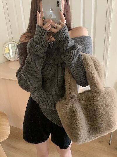 2024秋冬トップス 長袖 ニット レディースショートおしゃれ カラバリ肌見せカラーシンプルスタイルアッププル色っぽ 女っぽ カジュアル きれいめ 大人ネックファッション加工フェミニン秋冬春系