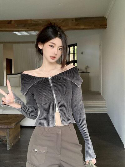 2024秋冬トップス 長袖 ニット 韓国トレンドコーデ セーター おしゃれ 色っぽ 女っぽスタンド丈カジュアルアップ きれいめ大人系ファッションレディース加工アップフェミニン フレンチダブル