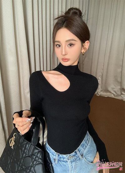 2024 春夏トップス ニット ハイネック 鎖骨見せ 長袖 サムホール 親指空き スリム 細見え 秋冬 黒 白 韓国ファッション レディース おしゃれ かわいい 大人っぽい カジュアル お出かけ