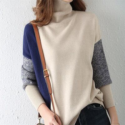 【2枚購入で3 00円OFF】ハイネック おしゃれ 百掛け 秋冬 コントラストカラー ゆったり ベ一シックニット 着痩せ 気質 セーター レディース トップス
