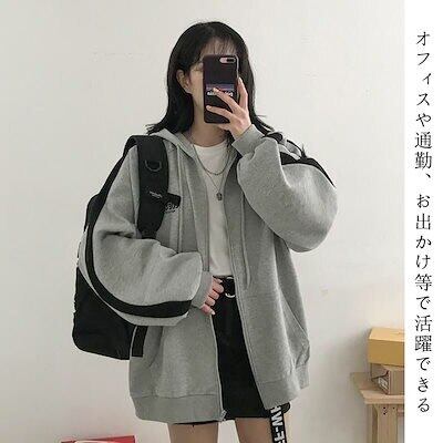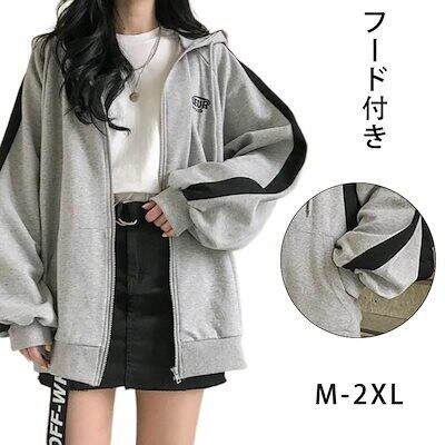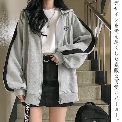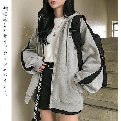 ジップパーカー韓国サイドラインフード付きカジュアルフルジップポケットゆったりグレーカジュアル部屋着