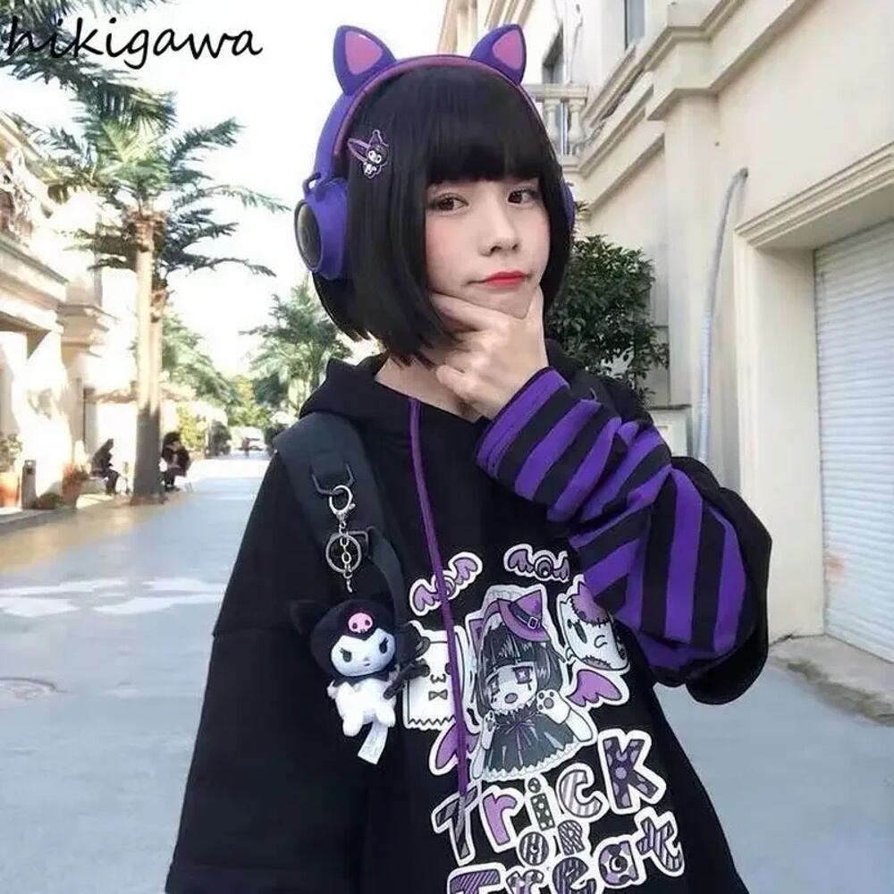 HikJEL-女性用フード付きスウェットシャツ,ツーピース,パッチワーク,フード付きスウェットシャツ,マンガ,アニメ,ブラック パーカー ジャージ y2k T240908165958_01